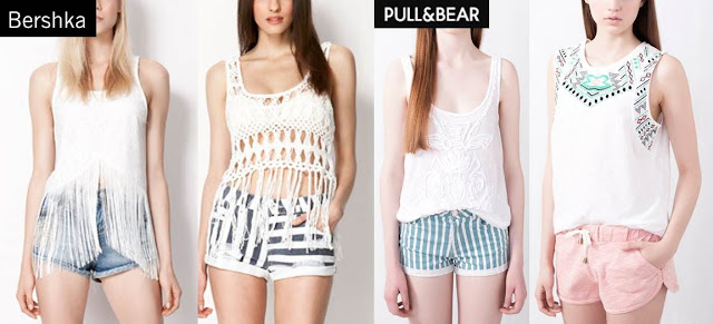 Tops un poco más largos o calados que siguen con la tendencia hippie, y que pueden quedar muy bien con una falda larga, en Bershka... o directamente, tops normales con bordados o estampados navajos que combinan con estos estilismos en Pull&Bear.
